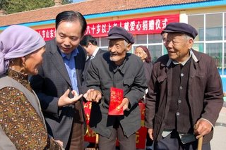 10月19日上午9:00,公司董事長(zhǎng)趙曰嶺帶著267床高級(jí)太空被及30000元現(xiàn)金來(lái)到大王鎮(zhèn)幸福公寓進(jìn)行慰問(wèn),受到了幸福公寓老人們的熱烈歡迎;10:00趙總又來(lái)到大王鎮(zhèn)西李村,向該村48位80歲以上的老人每人捐贈(zèng)300元現(xiàn)金,同時(shí),向全鎮(zhèn)所有80歲以上的老人每人捐款300元。在這次活動(dòng)中我公司共計(jì)捐款68萬(wàn)元,向社會(huì)奉獻(xiàn)了金嶺人的一片愛(ài)心,受到了社會(huì)各界的一致好評(píng)。