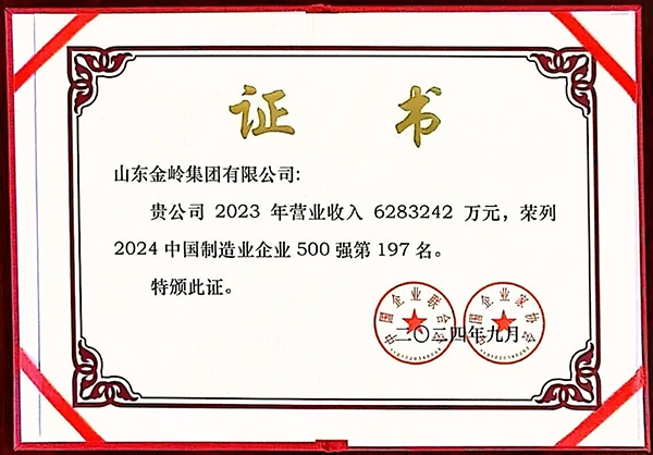 2024年9月,中國企業(yè)聯(lián)合會、中國企業(yè)家協(xié)會發(fā)布2024中國企業(yè)500強、2024中國制造業(yè)企業(yè)500強榜單,金嶺集團位列“2024中國企業(yè)500強”第385位;“2024中國制造業(yè)企業(yè)500強”第197位;公司已連續(xù)多年入圍中國企業(yè)500強、中國制造業(yè)企業(yè)500強。