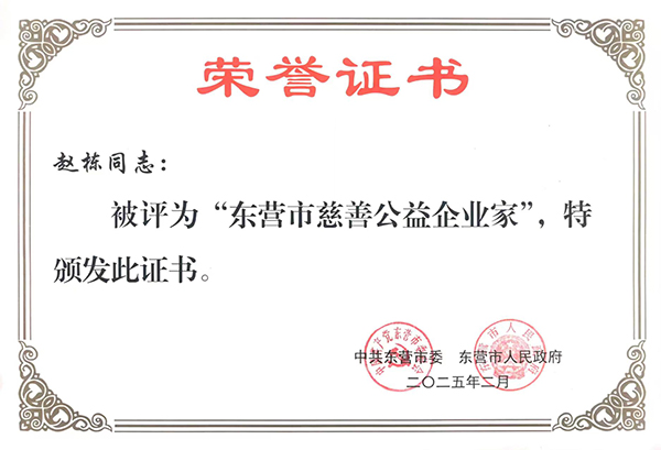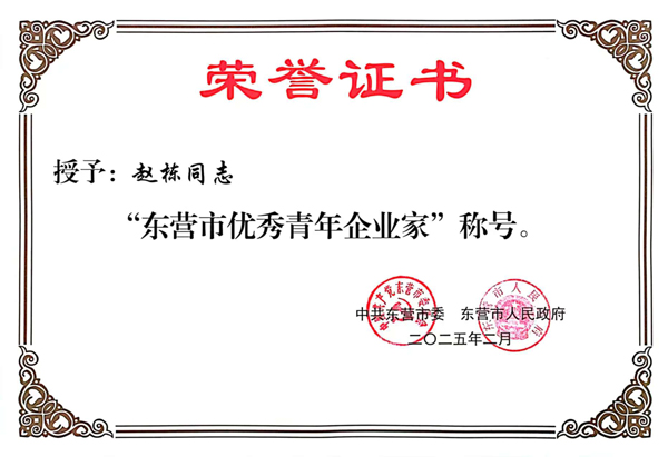 2025年2月10日,東營市優(yōu)秀企業(yè)和企業(yè)家表彰大會召開,集團(tuán)公司被評為“2024年度東營市納稅突出貢獻(xiàn)企業(yè)”,總裁趙棟被授予“東營市優(yōu)秀青年企業(yè)家”“東營市慈善公益突出貢獻(xiàn)企業(yè)家”榮譽(yù)稱號。